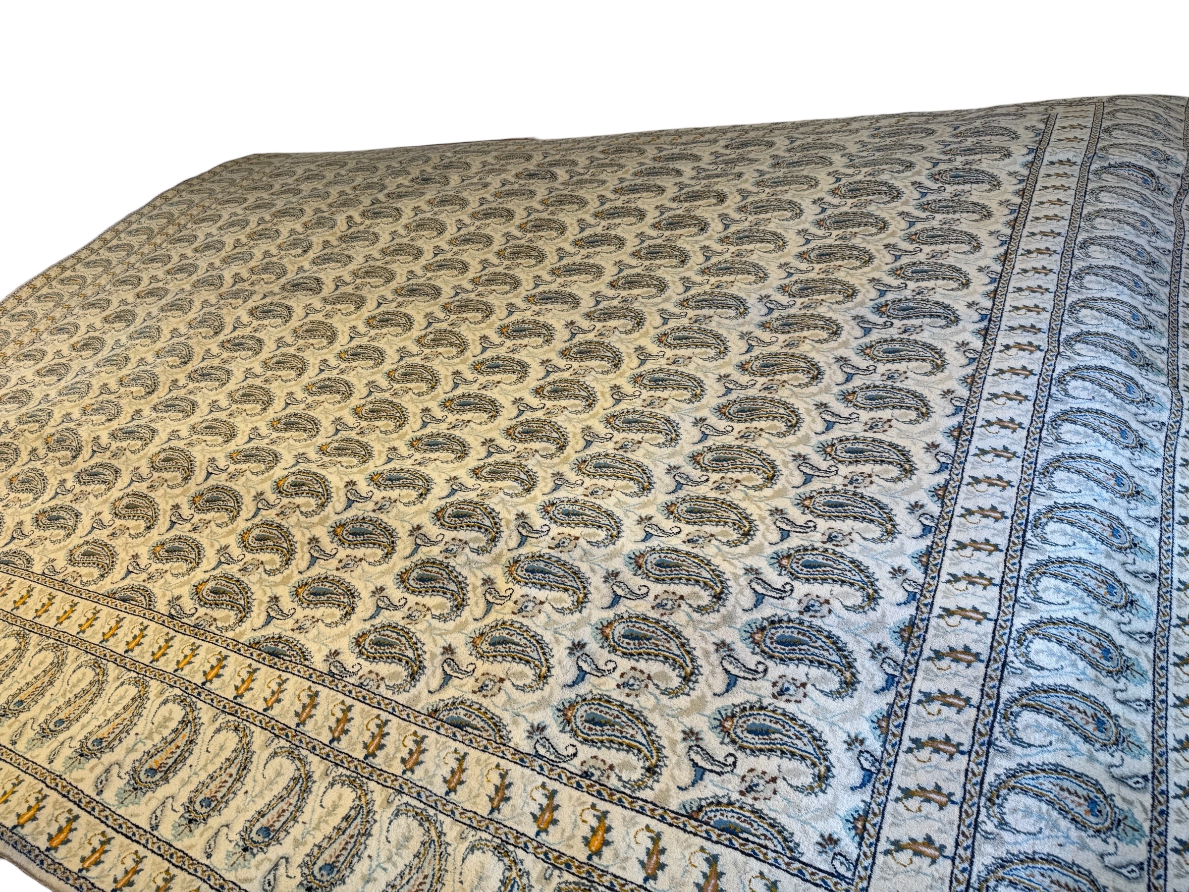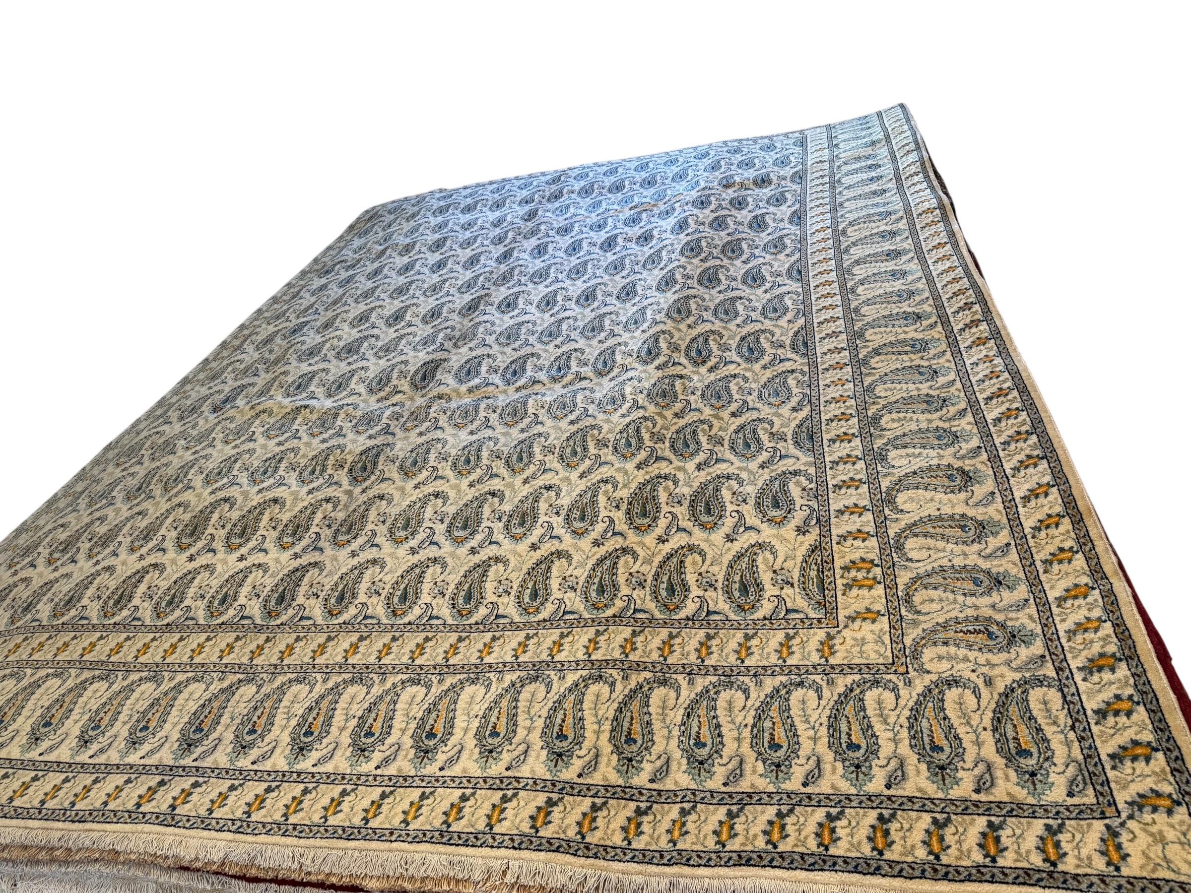 Kashan rugs are woven on cotton foundations in Persian knots with either silk or wool pile. The wool is of excellent quality, and can be very silky. In addition, the knots are quite firmly packed to form a dense, stiff carpet, the quality of which is determined by the size of the weft threads. The standard sizes for Kashans are 4×2, 5×3, 6×4, 12×9 and 13×10 feet.